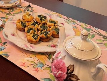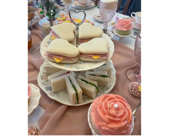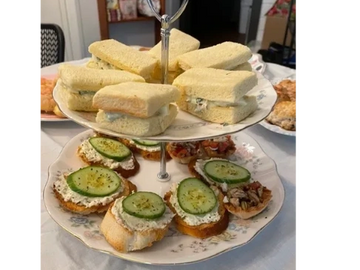 Enjoy a delightful assortment featuring a classic English cucumber sandwich, paired perfectly with English Rose tea options, along with a Lobster phyllo cup and a selection of Greek tea sandwiches, complemented by some French inspired sweets and an egg salad tea sandwich.